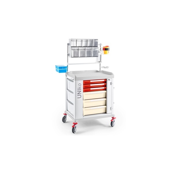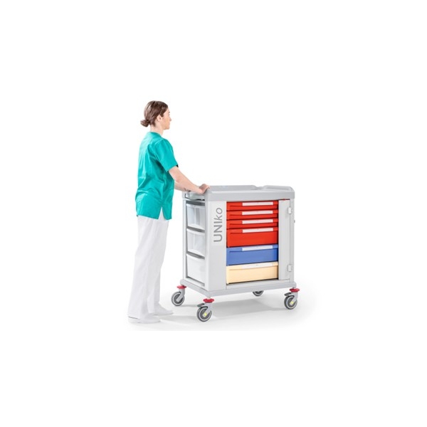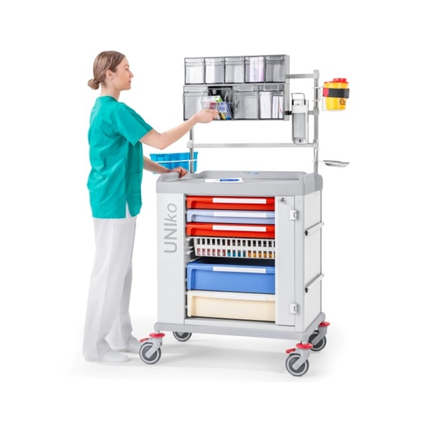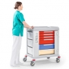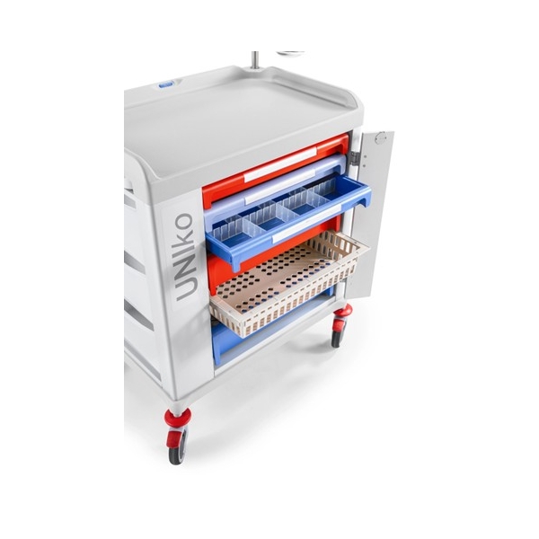 Gre za popolnoma prilagodljiv oddelekovni voziček, združljiv s pladnji ISO dimenzij, ki materiale in pripomočke dostavlja neposredno do mesta uporabe – čim bližje pacientu.                                                                                                                                                                                                                                        Tako kot drugi elementi sistema je na voljo v različnih barvah, ki omogočajo hitro prepoznavanje vsebine.